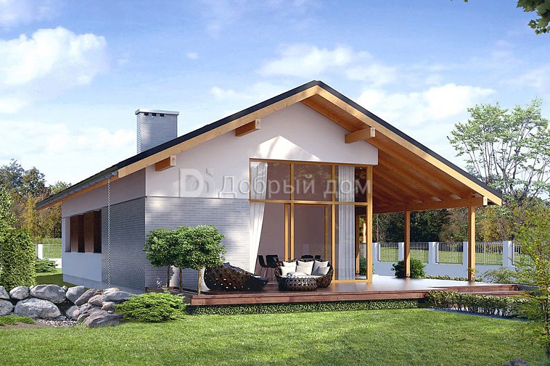 AS-2698 - светлый одноэтажный дом с двухскатной крышей отлично подойдёт семье из 4 человек. Особенности проекта: - Обеденный зал освещается солнцем сквозь панорамные окна, а тёплый камин добавит уюта семейному досугу. - Ванная комната расположена вблизи всех трёх спален. - На открытой террасе можно разместить кресла и любоваться природой в тёплое время года.