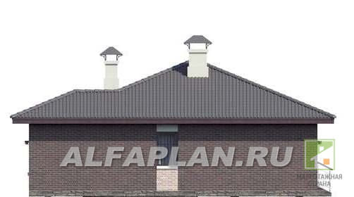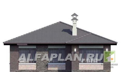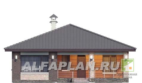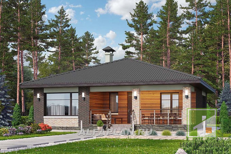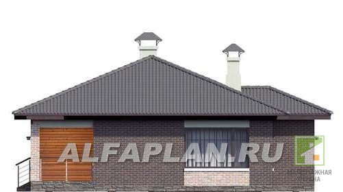 Проект большого одноэтажного коттеджа с гаражом на один автомобиль, большой террасой и четырьмя спальнями