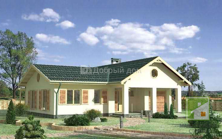 Проект одноэтажного каркасного дома AS-892F с гаражом. Особенности проекта - Главным преимуществом этого дома является его простор. Отсутствие второго этажа, с одной стороны, облегчает всю конструкцию, а с другой, компенсируется большой площадью. В таком доме может комфортно проживать небольшая семья. - Одноэтажный дом такой планировки отлично подойдет для молодой семьи, ценящей простор. Тут присутствуют одна спальня, детская комната просторная гостиная и столовая, два санузла и небольшой холл. К дому пристроен гараж на один автомобиль. Представленная отделка фасада дома взаимозаменяема. При желании, Вы можете использовать штукатурку с декоративными элементами, облицовочную плитку с фактурой под кирпич или камень, имитацию бруса с окраской и прочие варианты навесной облицовки, которая крепится к фасаду и не требует дополнительной опоры на фундаменте.
