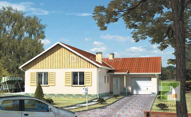 Проект одноэтажного каркасного дома AS-916-1F с гаражом. Особенности проекта - В доме есть все необходимое для проживания. Законченность экстерьеру придают крыльцо и небольшая терраса, а также кровля, которая служит защитной составляющей здания от внешних погодных условий. - В дом ведут два входа - центральный и боковой, через небольшую террасу. Проект дома предусматривает гостиную, кухню, гостевую, спальню, детскую, два санузла и холл, с которого можно попасть во все помещения. К дому пристроен гараж на одну машину и сравнительно большая комната отведена для котельной. Представленная отделка фасада дома взаимозаменяема. При желании, Вы можете использовать штукатурку с декоративными элементами, облицовочную плитку с фактурой под кирпич или камень, имитацию бруса с окраской и прочие варианты навесной облицовки, которая крепится к фасаду и не требует дополнительной опоры на фундаменте.