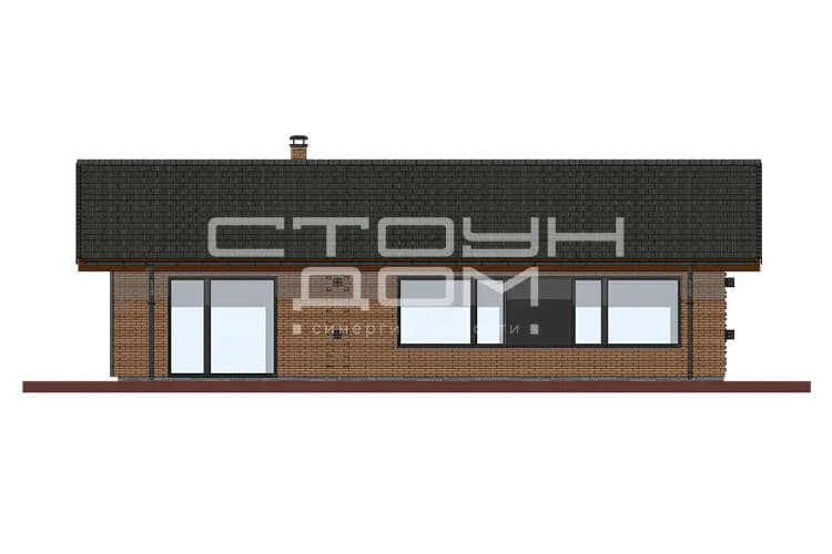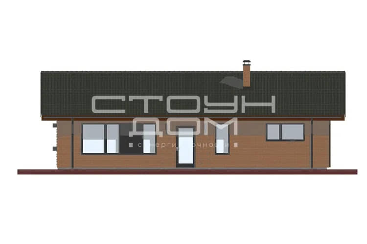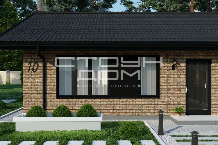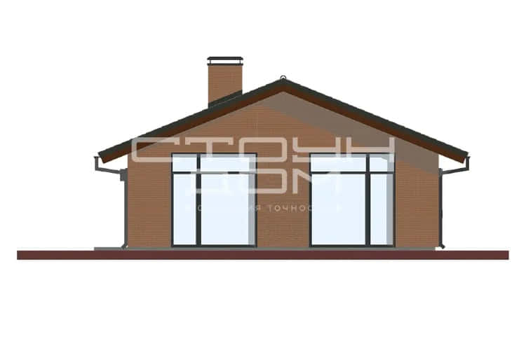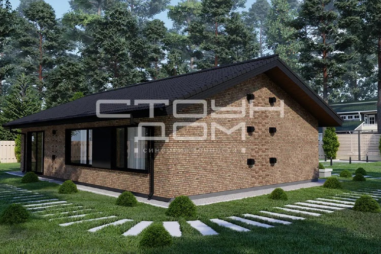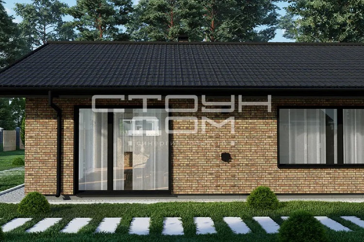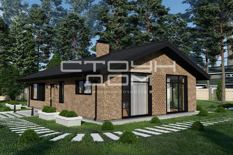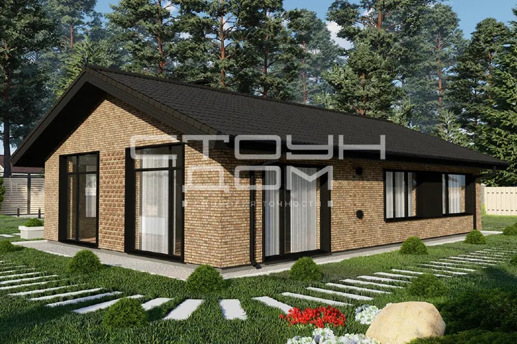 Одноэтажный дом для небольшой семьи, в доме предусмотрены две спальни, детская и большая гостиная, совмещенная с кухней. Объединённая кухня-гостиная 39,66 м2 с высокими потолками и панорамными окнами позволит легко собраться большой компанией, небольшое окно, над рабочей поверхностью кухонного стола, добавляет естественного освещения.