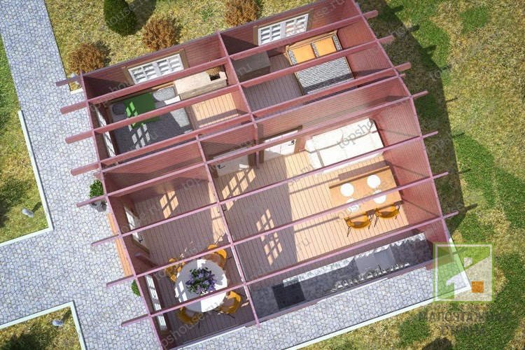Данный вариант дачного дома создан на основе сверхпопулярного проекта "Золотая середина" с точным сохранением внутренней планировки. Главная особенность нового проекта – полностью закрытая веранда, рассчитанная на комфортное использование в прохладное время года.