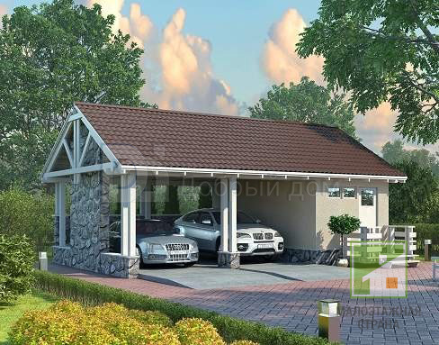 Проект AS-1560 - каркасный навес для парковки двух автомобилей с подсобным помещением для хранения инвентаря и инструментов.