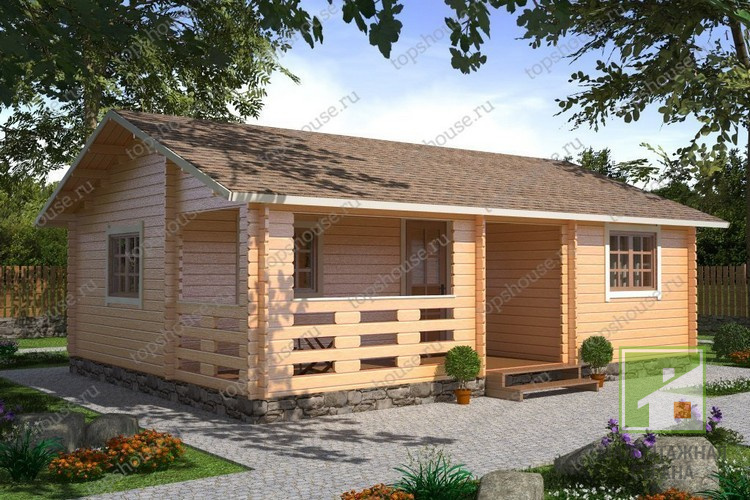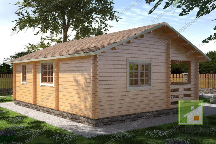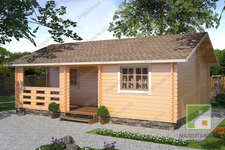 Планировка дома включает три помещения площадью 17,4, 6,5 и 9,3 кв. м, в которых можно обустроить гостиную, спальни, детскую комнату и другие функциональные зоны. Особенностью строения является просторная веранда для отдыха на свежем воздухе. Этот проект уже был реализован и отлично зарекомендовал себя в эксплуатации, но если возникнет необходимость внести в типовые чертежи какие-либо изменения, наши специалисты всегда пойдут навстречу вашим пожеланиям.