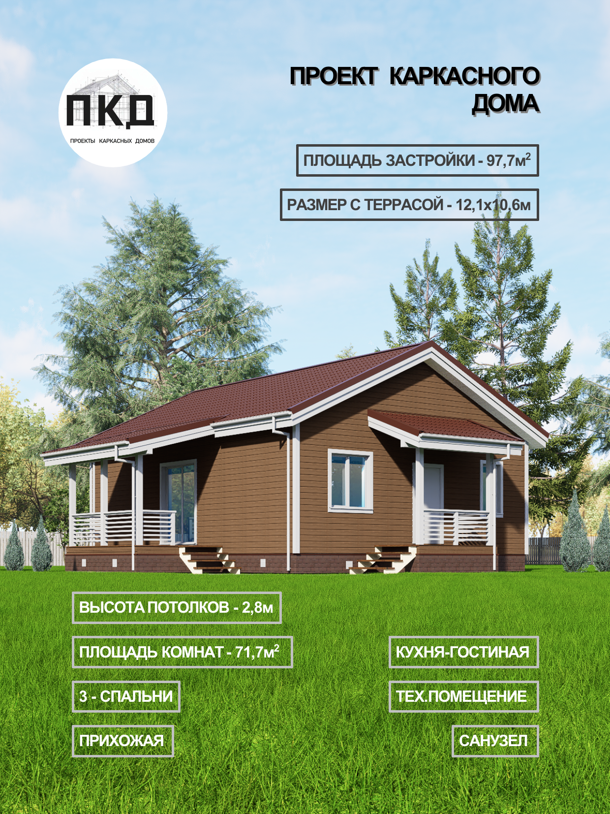 Проект одноэтажного каркасного дома с 3 спальнями 103 м2 и просторной террасой